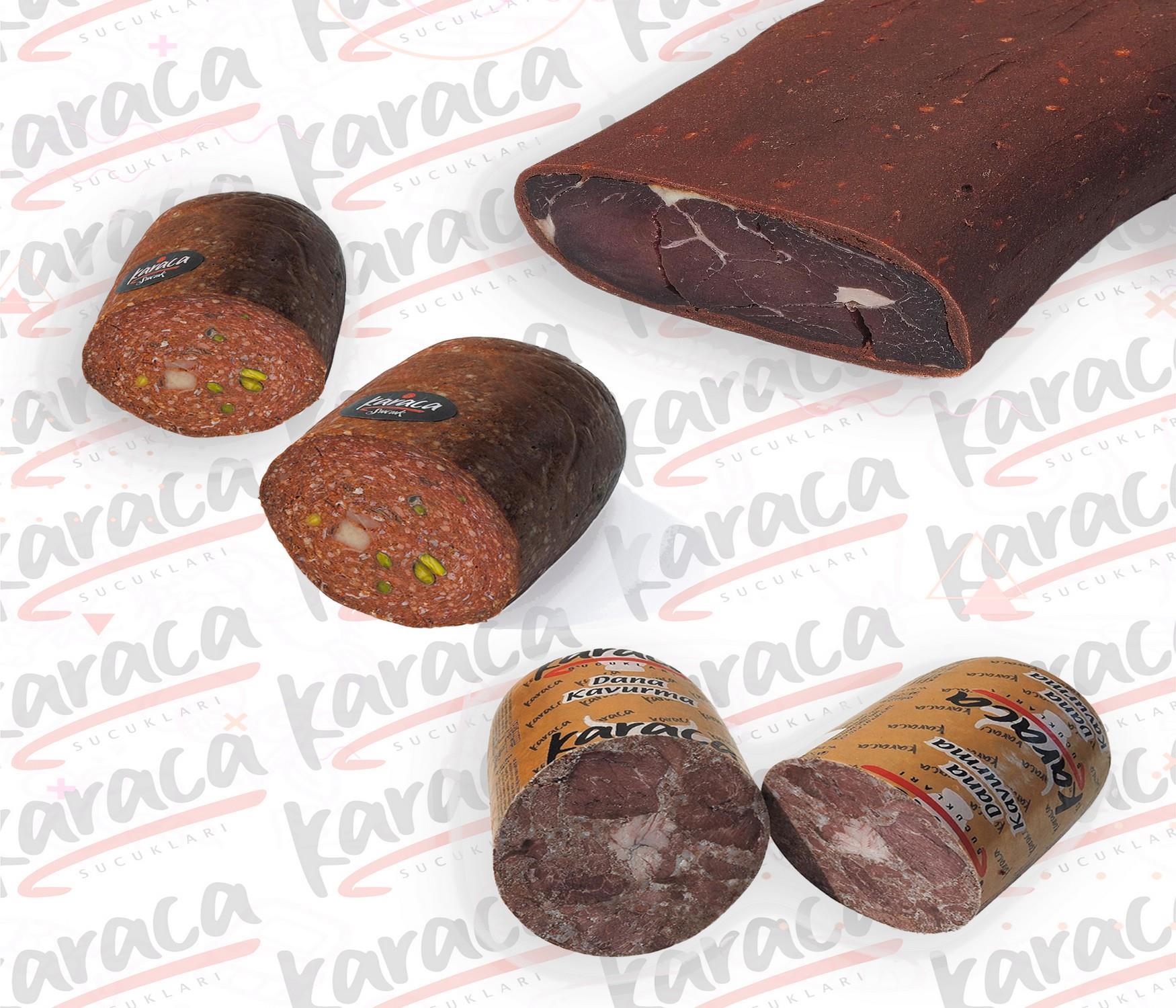 Karaca  Göden Antep Fıstıklı ve Hellim Peynirli Sucuk 1000 Gr Sırt Pastırma 1000 Gr Blok Dana Kavurma 1000 Gr